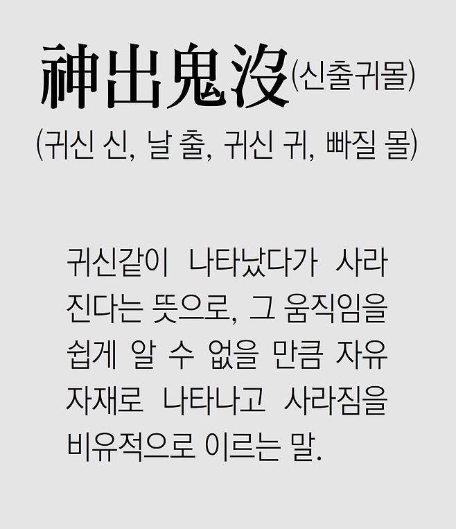 "뛰어난 자의 움직임은 귀신처럼 나타났다가 사라지며(神出而鬼行) 별이 빛나고 하늘이 운행하는 것 같아서 나아가거나 물러서거나 구부리거나 펴거나 그 어떤 조짐이나 흔적이 보이지 않는다. 마치 난새가 일어나고 기린이 달려 나가듯이, 봉황새가 날고 용이 승천하듯이, 가을바람과 같이 나타나고 놀란 용처럼 빠르다"고 했고, 중국의 대표적 병법서인 육도삼략(六韜三略)에도 '신출귀행(神出鬼行)'이란 표현이 나와 있습니다.