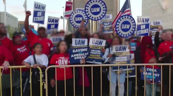 [파업하는 전미자동차노조(UAW) 조합원들.]