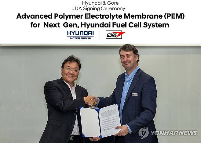 (서울=연합뉴스) 현대자동차·기아가 미국 고어와 현대차·기아 마북연구소에서 차세대 수소전기차 전해질막 공동개발 협약을 체결했다고 5일 밝혔다. 사진은 협약 체결 후 기념 촬영하는 김창환 현대차·기아 수소연료전지개발센터장 전무(왼쪽)와 맷 로사 고어 퍼포먼스 솔루션 부문 리더. 2024.1.5 [현대차·기아 제공. 재판매 및 DB 금지]