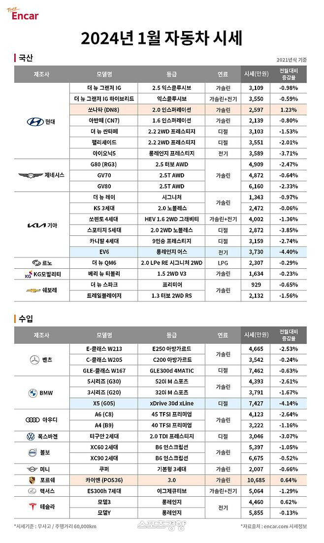 기아 스포티지 5세대 2.0 2WD 노블레스는 3.85% 국산차 중 가장 많이 시세가 하락했으며, 카니발 4세대 9인승 프레스티지도 2.74% 떨어졌다. 주행거리 기준은 60,000km이며 무사고 차량 대상 분석 자료 계측치다.