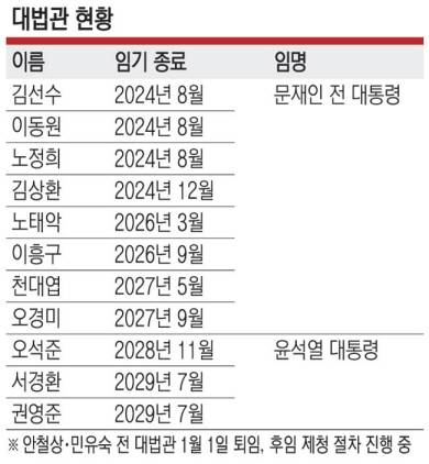 올해는 추가로 4명의 대법관 임기가 만료된다. 오는 8월에는 김선수·이동원·노정희 대법관 등 3명이 임기를 마치고 법복을 벗는다. 연말인 12월엔 김상환 대법관이 법원을 떠난다. 올해 대법관 6명이 바뀌면 윤석열 대통령이 임명한 대법관이 9명에 이르게 된다. 올해 퇴임하는 6명 가운데 진보로 분류되는 인물이 4명(민유숙·김선수·노정희·김상환)에 달해 대법원의 중도·보수 우위 성향이 강화할 가능성이 크다. 새 대법관 자리가 중도·보수 성향 인사로 채워지면 대법관 중 진보 인사는 이흥구·오경미 대법관만 남게 된다.