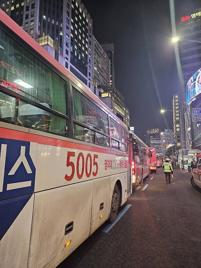 | 명동입구 정류장에 들어가기 위해 버스들이 줄지어 서 있는 모습. 이희진 기자 |