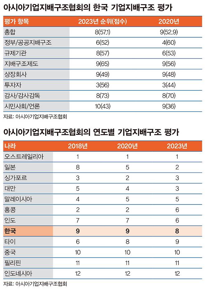 평가는 △정부/공공지배구조 △규제기관 △지배구조제도 △상장회사 △투자자 △감사/감사감독 △시민사회/언론 등 7개 부문으로 이뤄졌다. 한국은 총 57.1점으로 오스트레일리아(75.2), 일본(64.6), 싱가포르(62.9), 대만(62.8), 홍콩(61.5), 인도(59.4) 등에 이어 8위였다. 2020년 평가(9위)보다 한 단계 올랐지만 여전히 낙후됐음을 보여준다. 중장기적 관점에서 기업지배구조 개혁 방안을 제시하는 일관된 정부 정책을 중요하게 여기는 정부/공공지배구조 부문에서 52점을 받아, 3년 전 성적표보다 8점이 적어져 4위에서 6위로 미끄러졌다. 기업지배구조 개선을 위한 정부 정책이 뒷걸음쳤단 뜻이다.