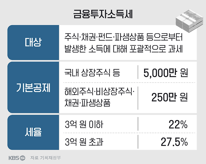 2020년 여야 합의로 마련된 '금융투자소득세'(금투세)도 그런 원칙에 따라 만들어졌습니다. 금투세는 주식·채권·펀드 등 금융투자로 발생한 양도소득에 부과하는 세금입니다. 하지만 모든 금융소득에 매겨지는 것은 아닙니다. 국내 상장 주식 기준 연간 5,000만 원까지는 수익을 내더라도 비과세입니다. 연 5,000만 원 넘는 차익을 거둔 투자자에게는 수익의 22%(지방세 포함), 3억 원을 넘기면 27.5%를 세금으로 내도록 했습니다.