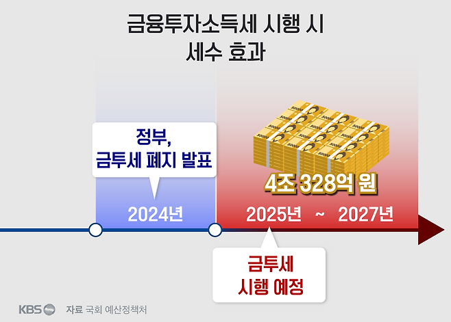 국회 예산정책처에서 2022년 발표한 '세법개정안 분석' 보고서를 보면 금투세가 기존 여야 합의대로 내년 1월부터 시행될 경우 매년 평균 1조 3,443억 원의 세수가 더 들어올 것으로 추정했습니다. 2025년부터 2027년까지 3년간 추정 세수는 4조 328억 원입니다.