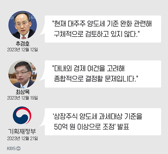 비슷한 상황은 지난해 연말에도 있었습니다. 지난달(2023년 12월) 12일 추경호 전 경제부총리는 임기 마지막으로 연 기자 간담회에서 주식 양도세를 부과하는 대주주 기준 완화에 대해 "구체적으로 검토하고 있지 않다"고 밝혔습니다.