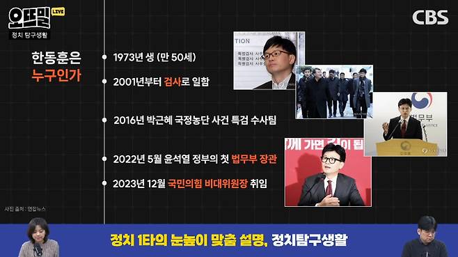 ◇ 채선아> 하루가 다르게 바뀌는 정치 뉴스 알면 좋은 포인트만 쏙쏙 집어 설명해 드립니다. 정치 탐구생활. 오늘 탐구해 볼 주제는 바로 국민의힘 한동훈 비상대책위원장입니다. 현재 만 50세. 2001년부터 검사로 일하기 시작해서 2022년 5월 윤석열 정부의 첫 법무부 장관을 맡았고요. 2023년 12월 21일 여당인 국민의힘의 비대위원장 즉 당 대표가 됐습니다. 대체 어떤 인물인지 자세히 탐구해 보겠습니다. 김민하 시사평론가, 나오셨어요. 안녕하세요.