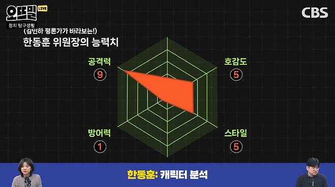 ◇ 채선아> 대통령과 너무 가까운 비대위원장이 임명되는 것에 대한 우려가 있었음에도 불구하고 한동훈 전 장관이 비대위원장이 됐잖아요. 대체 이 한동훈 위원장이 어떤 사람인가, 어떤 능력치를 가졌나 오늘 한번 살펴보려고 합니다. 저희가 한동훈 위원장의 능력치를 한번 분석해봤어요. 공격력, 방어력, 호감도, 스타일별로 준비했는데요. 먼저 공격력, 김민하 평론가가 10점 만점에 9점을 주셨네요.