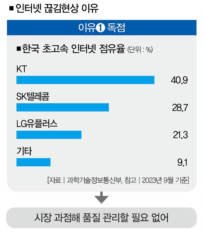 이 말은 과장이 아닙니다. SK텔레콤·KT·LG유플러스 등 통신3사의 초고속인터넷 시장점유율은 90.9%(과학기술정보통신부·2023년 9월 기준)에 달합니다. 이렇게 어마어마한 점유율이 가능한 건 통신3사가 휴대전화 요금제 등과 결합해 할인해 주는 '결합상품' 서비스로 소비자를 묶어두고 있어서입니다.