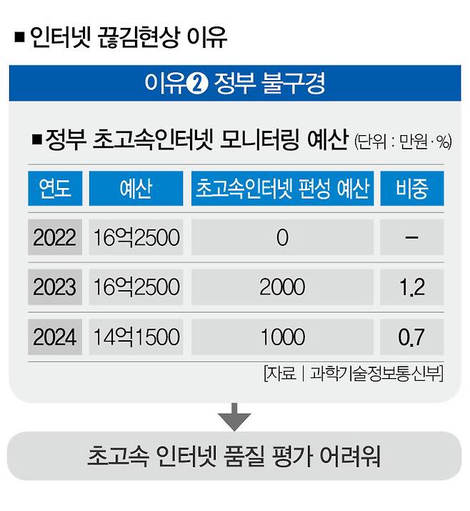 정부의 미적지근한 대응은 이뿐만이 아닙니다. 일례로 과기부는 2024년 '통신서비스 품질평가' 사업에 14억1500만원의 예산을 편성했는데, 이중 초고속인터넷의 품질을 평가하는 사업비는 1000만원(비중 0.7%)에 불과합니다.