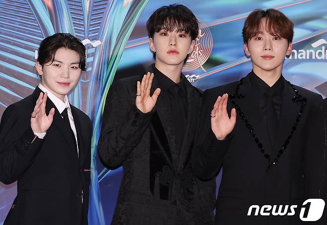 (서울=뉴스1) 권현진 기자 = 세븐틴의 우지(왼쪽부터)와 호시, 승관이 6일(현지시간) 인도네시아 자카르타 인터내셔널 스타디움에서 열린 '38회 골든디스크 어워즈 with 만디리' 레드카펫 행사에서 포즈를 취하고 있다. (골든디스크 어워즈 사무국 제공) 2024.1.6/뉴스1