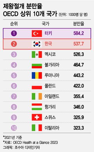 특히 우리나라 제왕절개 분만율은 세계적인 수준이다. OECD(경제협력개발기구)가 최근 공개한 '한눈에 보는 보건의료 2023'(Health at a Glance 2023)을 보면 2021년 기준 한국의 제왕절개 분만율은 1000명당 537.7명으로 터키에 이어 세계에서 두 번째로 많다. 지난 2017년 4위에서 두 계단 상승한 것이다. 건강보험심사평가원·국민건강보험공단에 따르면 국내 제왕절개 분만율은 2014년 38.7%에서 2018년 47.3%, 2022년에는 61.7%로 급상승했다. 2014년 대비 2022년분만 건수는 43만건에서 26만건으로 거의 반토막 났지만 제왕절개 건수는 16만건에서 15만건으로 소폭 줄어드는 데 그쳤다.