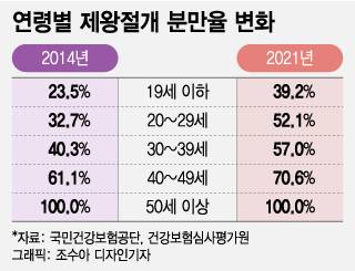 제왕절개는 더는 고령 임신에 해당하는 30~40대의 전유물이 아니다. 오히려 나이가 어릴수록 제왕절개 분만율이 훨씬 가파르게 상승한다. 10대 산모는 2014년 4명 중 1명(23.5%)이 제왕절개를 했지만 2021년에는 3명 중 1명(39.2%)이 제왕절개를 선택했다. 같은 기간 20대 제왕절개 분만율은 32.7%에서 52.1%로 20%포인트가량 올라 30대(40.3%→57%)에 육박할 만큼 상승했다. 40대 역시 61.1%에서 70.6%로 상승해 모든 연령대에서 제왕절개를 선택하는 경우가 늘어난 것으로 파악됐다.