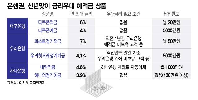 은행권 관계자는 "연말·연초마다 정기예금이 빠지고 요구불이 늘어 은행권이 부동자금을 잡기 위해 금리를 높이는 등 우대 이벤트를 벌인다"라며 "향후 시장금리 하락이 예상되는 만큼 예적금 가입을 고민 중인 고객이라면 이번 기회를 적극적으로 검토해볼 만 한하다"고 말했다.