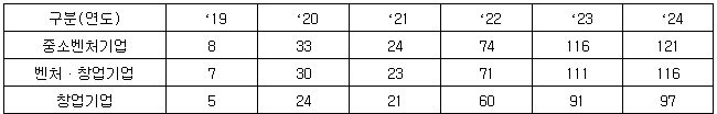 이 중 벤처·창업기업은 7개로 미드바르, 스튜디오랩, 탑테이블, 지크립토, 원콤, 로드시스템, 만드로 등이다.