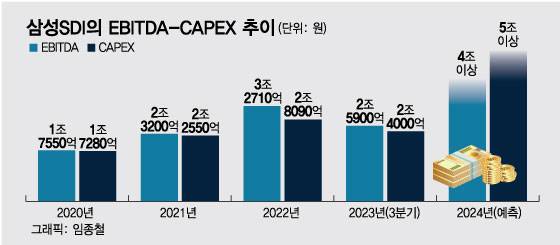 삼성SDI는 2020년 이후 '번 만큼 투자한다'는 원칙을 유지해왔다. 경쟁사인 LG에너지솔루션과 후발주자인 SK온이 전기차 시장의 개화에 맞춰 양적성장을 적극 추구해온 것과 온도차가 있었다. 지난해 LG에너지솔루션은 10조원, SK온은 7조원 수준의 CAPEX를 기록한 것으로 분석되고 있다. 삼성SDI는 이에 크게 못미치는 3조원 대일 것으로 보인다.