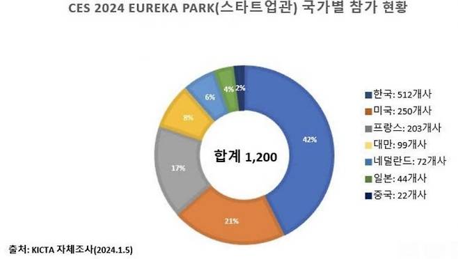 특히 스타트업으로 채워지는 유레카 파크관은 전체 1200여개 업체 중 ▲한국 512개 ▲미국 250개 ▲프랑스 203개 ▲대만 99개 ▲네덜란드 72개 ▲일본 44개 등으로 한국이 42%를 차지하며 가장 많은 기업이 참여한다.