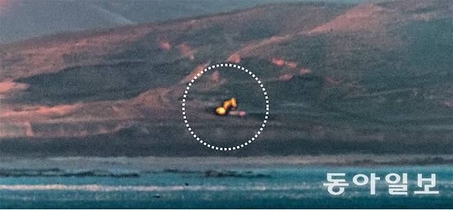 | 北 개머리해안 진지서 포착된 화염 7일 오후 인천 옹진군 대연평도에서 약 15km 떨어진 북한 개머리해안 일대 해안포 진지에서 폭발음과 함께 화염(점선 안)이 포착된 모습. 북한의 포 사격 소리가 이날 수십 분간 이어졌는데, 이 화염이 포착된 이후 포격 소리는 멈췄다. 연평도=양회성 기자 yohan@donga.com |