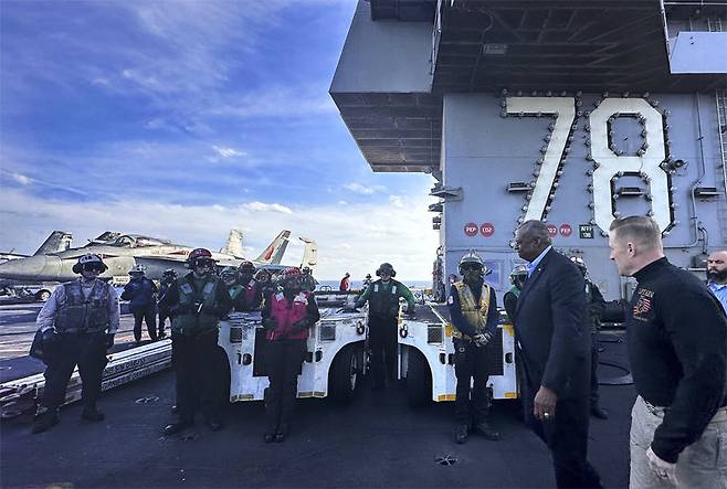 | 지난달 美항모 방문 지난해 12월 20일 이스라엘과 팔레스타인 무장단체 하마스 간 전쟁의 확전을 막고자 이스라엘 인근으로 파견한 미국 해군의 항공모함 ‘제럴드 포드’를 깜짝 방문한 로이드 오스틴 미 국방장관(오른쪽에서 두 번째). 이는 오스틴 장관의 가장 최근 공식석상 모습으로, 그는 1일부터 중환자실에 입원한 뒤 사흘이 지난 4일에야 백악관에 이 사실을 보고했다. AP 뉴시스 |