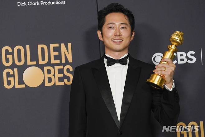[로스앤젤레스=AP/뉴시스] 한국계 미국 배우 스티븐 연이 7일(현지시각) 미 캘리포니아주 로스앤젤레스의 베벌리힐튼 호텔에서 열린 제81회 골든글로브 시상식에서 넷플릭스 드라마 '성난 사람들'(BEEF)로 남우주연상을 받고 포즈를 취하고 있다. 이성진 감독의 '성난 사람들'은 이날 작품상·남우주연상·여우주연상(앨리 웡) 등 3관왕에 올랐다. 2024.01.08.