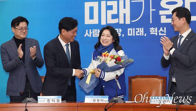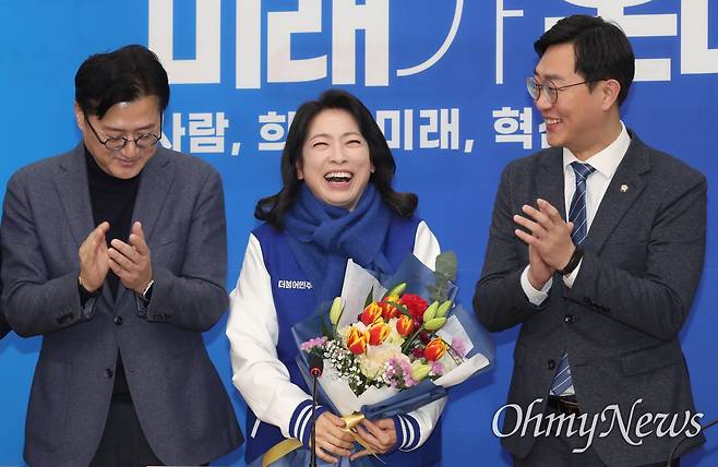 | ▲ 황정아 한국천문연구원 책임연구원이 8일 서울 여의도 국회에서 열린 더불어민주당 인재영입식에서 조승래 의원에게 꽃다발을 받고 있다. 왼쪽부터 홍익표 원내대표, 조승래 의원, 황 책임연구원, 장경태 최고위원. |