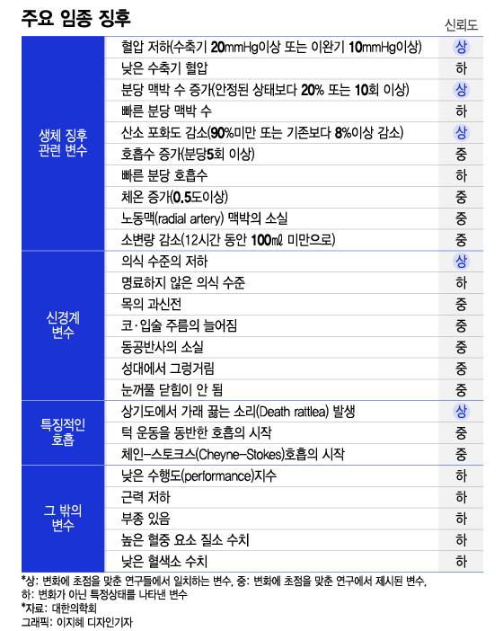 대한의학회는 지난 2016년 '연명의료결정법' 시행을 앞두고 말기(수개월 이내에 사망할 것으로 예상되는 상태)와 임종기(사망이 임박한 상태를)에 대한 정의와 의학적 판단 지침을 마련한 바 있다. 혈압 저하, 맥박수 증가, 가래 끓는 소리(death rattle) 등 주요 임종 징후를 수많은 연구를 기반으로 객관적으로 정리했다. 해당 파트 작성을 책임진 황인철 가천대길병원 완화의료팀장(가정의학과 교수)에게 일반인이 궁금해하는 임종 전 증상을 물었다.
