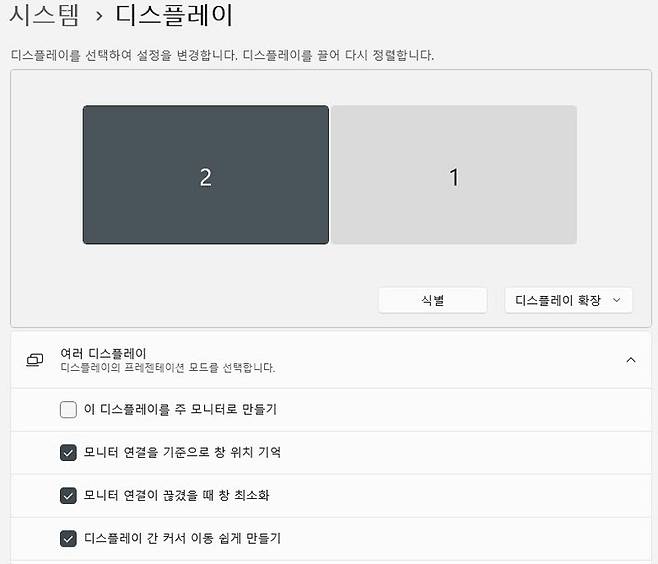 양쪽 모니터 사이에 마우스 커서가 통과하지 못하는 경우 모니터 순서가 반대로 설정됐을 가능성이 높다. 실제로 왼쪽에 있는 모니터가 디스플레이 설정에서는 오른쪽에 배치된 게 아닌지 확인해 보자. 실제 모니터 위치에 맞게 정렬하면 정상적으로 마우스 커서를 이동할 수 있다.