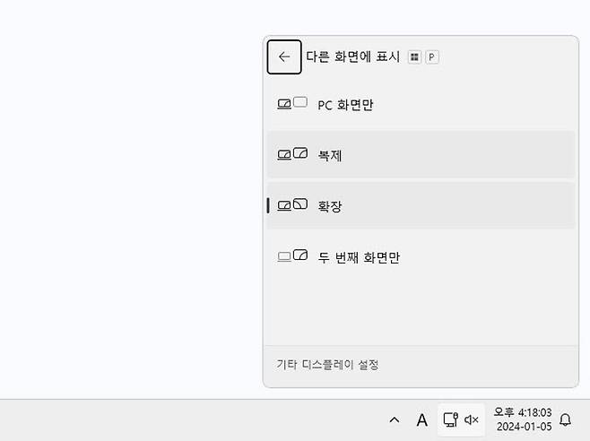 양쪽 모니터에 동일한 화면이 보인다면 다중 모니터 모드가 적용된 것이다. [Win + P] 단축키를 누르면 듀얼 모니터 설정 팝업이 나타난다. '복제'를 선택하면 양쪽 모니터에 동일한 화면이 출력되며, '확장'을 선택하면 양쪽 모니터가 이어진 것처럼 사용할 수 있다.