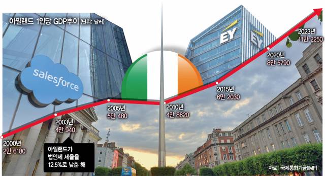 유로존(유로화 사용 20개국) 재정 위기 당시인 2011년만 해도 ‘유럽의 병자’로 꼽힐 만큼 부침이 심했던 아일랜드의 극적 성장은 어떻게 가능했을까. 아일랜드 성장의 핵심 동력으로는 첫손에 파격적 법인세가 꼽힌다. 아일랜드는 지난해까지 최근 20년간 법인세 세율을 유로존 최저 수준인 12.5%로 유지하고 있다. 실제 더블린은 2003년 구글 유치를 기점으로 메타(옛 페이스북), 아마존, X(옛 트위터), 세일즈포스 등 미국 실리콘밸리를 대표하는 테크 기업의 유럽 전초 기지로 자리매김했다. 이들 기업이 몰린 더블린 그랜드 캐널독 지구는 ‘유럽의 실리콘밸리’로 명성이 높다.