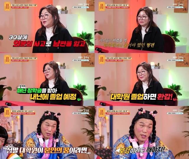 [마이데일리 = 이승길 기자] 의문의 살인 사건으로 남편을 잃은 후 자신의 삶마저 잃어버렸던 58세 만학도의 꿈에 대한 이야기가 8일 KBS Joy '무엇이든 물어보살'에서 전파를 탔다.