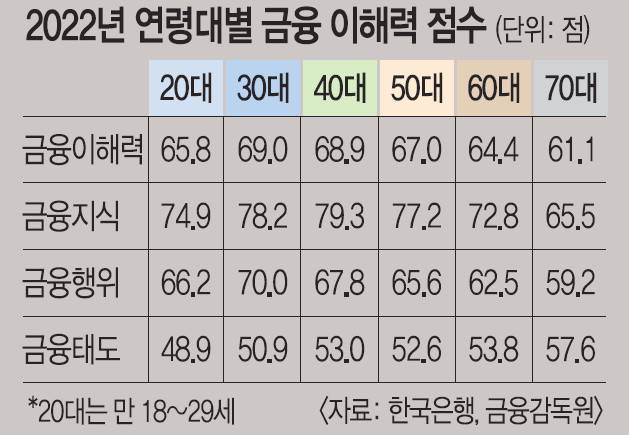8일 한국은행·금융감독원이 2022년 공동으로 진행한 ‘전 국민 금융 이해력 조사’에 따르면 우리나라 만 18~79세의 금융 이해력 점수는 66.5점이다. 연령별로는 30대가 69.0점으로 가장 높았다. 40대(68.9점) 50대(67.0점)도 평균 이상이었다.