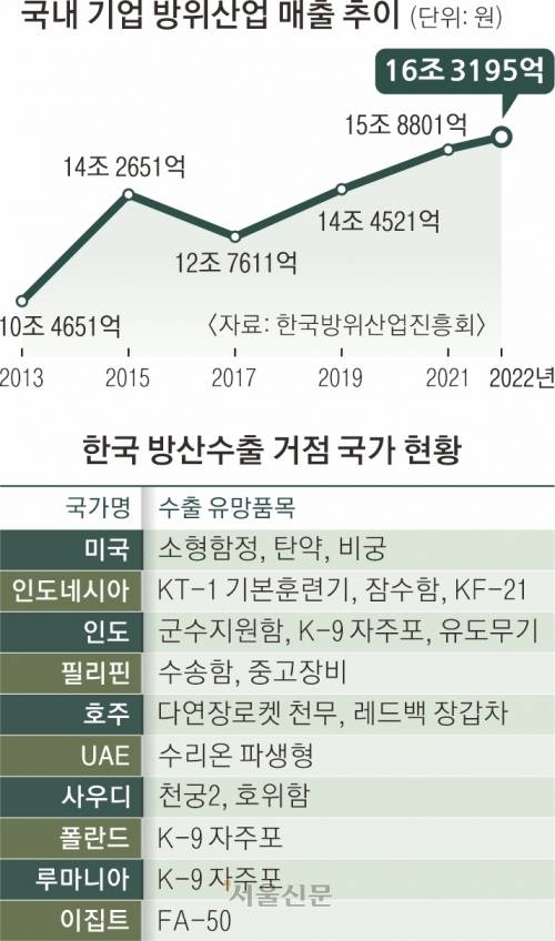 국방부에 따르면 우리 방산기업은 지난해 약 130억 달러의 수출 실적을 달성했다. 2022년 173억 달러보다 43억 달러 줄어들어 당초 목표였던 200억 달러 수출 목표를 이루지는 못했다.