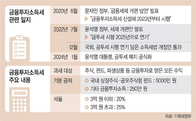 금투세는 2020년 12월 소득세법 개정안 통과로 지난해부터 적용될 예정이었으나, 개인투자자들의 거센 조세 저항에 부딪힘에 따라 시행 시기를 두고 논란이 일었다. 코로나19 팬데믹 이후 증시에 유동성이 흘러넘치면서 개인투자자 1400만 명 시대가 열리자, 금투세는 ‘공공의 적’이 될 수밖에 없었다. 지난 대통령 선거 과정에서 당시 윤석열 후보가 금투세 폐지를 공약하면서 본격적으로 수면 위로 떠올랐다. 금투세 유예에 반대해 왔던 더불어민주당도 이재명 당시 후보가 개미 투자자의 피해를 이유로 ‘신중론’을 제기하자 입장을 선회했다. 결국 여야는 금투세 시행을 목전에 둔 2022년 12월에 시행시기를 2025년으로 늦추는 데 합의했다. 글로벌 고금리로 주식시장이 하락장을 맞고 있던 점도 시행을 늦추는 명분이 됐다.
