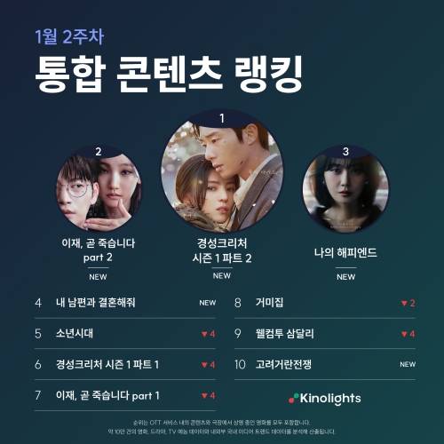 콘텐츠 커뮤니티 키노라이츠가 1월 2주 차 통합 콘텐츠 랭킹을 공개했다.