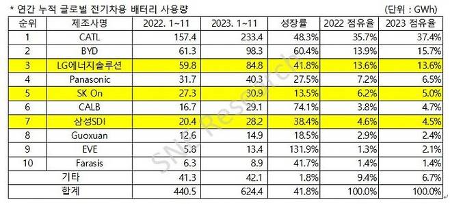 9일 시장조사업체 SNE리서치에 따르면 2023년 1월부터 11월까지 글로벌 전기차 배터리 사용량은 624.4 기가와트시(GWh)로 전년 동기 대비 41.8% 성장했다.
