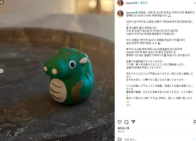 이날 소속사는 "이아유미의 가정에 감사하게도 소중한 생명이 찾아왔고 올해 6월에 출산 예정이다. 이제 곧 부모가 되는 이아유미에게 많은 축복과 응원을 보내주시면 감사하겠다"라고 밝혔다.