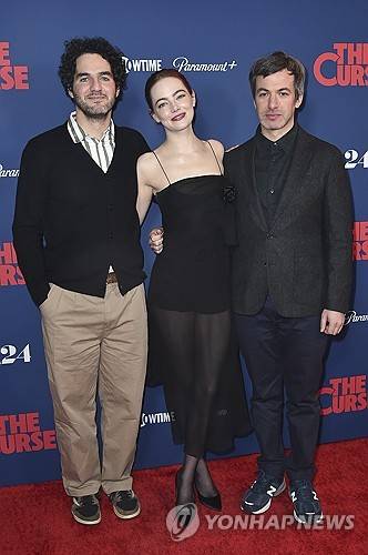 Benny Safdie, from left, Emma Stone and Nathan Fielder attend the season one finale celebration for "The Curse" on Monday, Jan. 8, 2024, in Beverly Hills, Calif. (Photo by Richard Shotwell/Invision/AP) 010824130007, 21334631,
