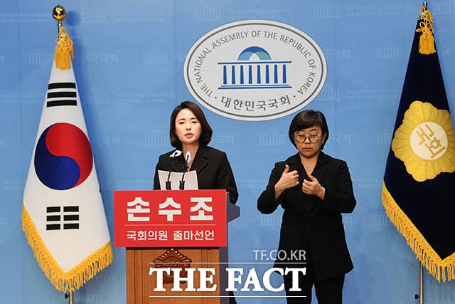 손수조 리더스클럽 대표가 9일 오후 서울 여의도 국회 소통관에서 제22대 국회의원 선거 경기 동두천시 연천군 출마선언 기자회견을 하고 있다.