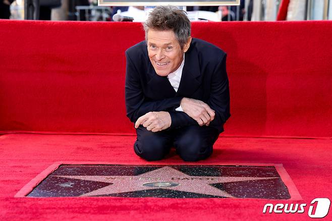 (로스앤젤레스 로이터=뉴스1) 정지윤 기자 = 8일(현지시간) 미국 캘리포니아주 로스 앤젤레스의 할리우드 명예의 거리에 이름이 새겨진 윌렘 데포가 기념 사진을 남기고 있다. 2024.01.08