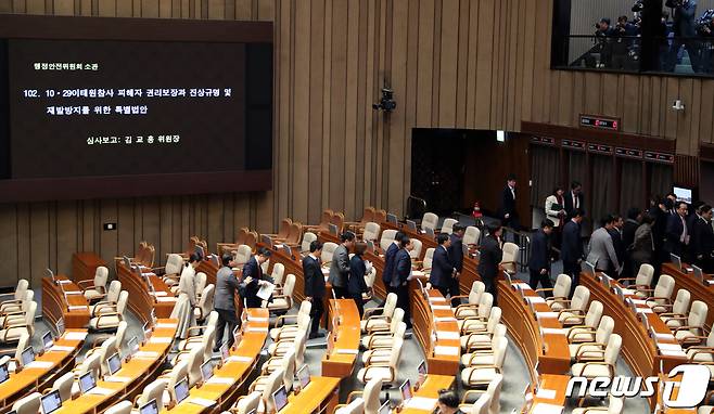 (서울=뉴스1) 이승배 기자 = 9일 오후 서울 여의도 국회 본회의장에서 열린 제411회 국회(임시회) 제4차 본회의에서 10.29 이태원 참사 진상규명과 재발 방지를 골자로 한 이태원 참사 특별법 수정안 표결을 앞두고 국민의힘 의원들이 본회의장을 나서고 있다.