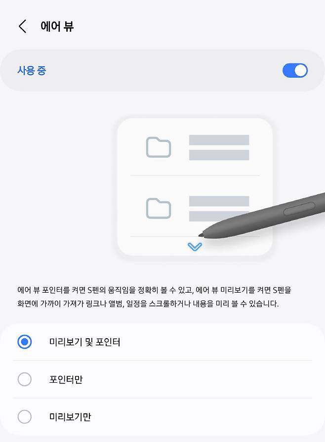 S펜 '에어 뷰' 기능을 사용하면 펜촉이 화면에 가까이 있을 때 동그란 포인터가 나타난다. 이 기능을 켜고 S펜을 화면 가까이 가져갔더니 포인터가 실제 펜촉 위치에서 오른쪽으로 1mm 정도 떨어진 위치에 표시됐다. 분명 문제가 있었다.