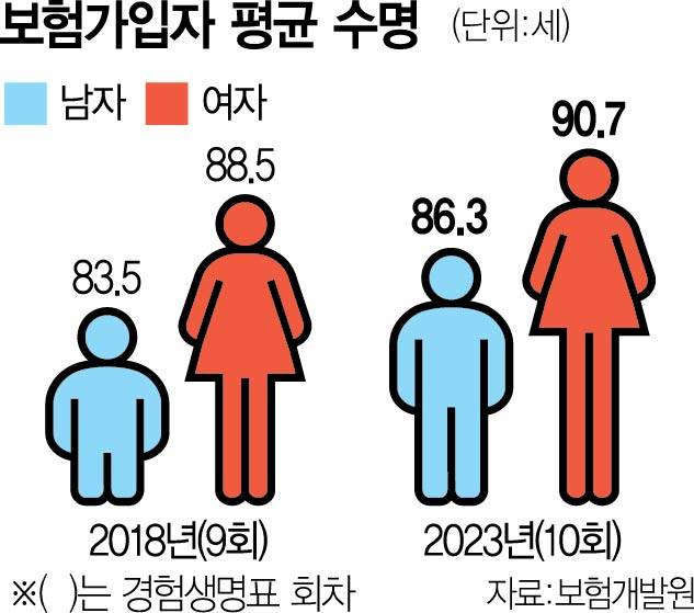 9일 보험 업계에 따르면 보험개발원이 5년마다 작성하는 경험생명표가 올해 4월 변경된다. 경험생명표는 보험 가입자의 성별·연령별 사망률을 정리한 표로, 각 보험사는 이를 바탕으로 새로 판매하는 보험 상품의 보험료를 결정한다. 최근 보험개발원이 작성을 마친 ‘10회 경험생명표’에서는 보험 가입자의 평균수명이 남자 86.3세, 여자 90.7세로 5년 전보다 각각 2.8세, 2.2세 증가했다. 수명이 늘어난 만큼 보험 상품의 보장 기간이 늘어나게 돼 보험료가 오를 가능성이 높아졌다.