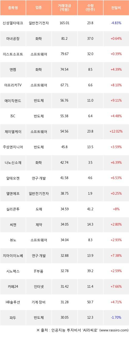 외국인 투자자의 순매수 상위 20개 종목은 신성델타테크, 마녀공장, 이스트소프트, 엔켐, 아프리카TV, 에이직랜드, ISC, 제이엘케이, 주성엔지니어링, 나노신소재등이다.