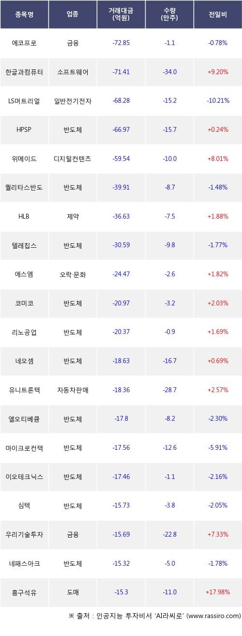 외국인 투자자의 순매도 상위 20개 종목은 에코프로, 한글과컴퓨터, LS머트리얼즈, HPSP, 위메이드, 퀄리타스반도체, HLB, 텔레칩스, 에스엠, 코미코등이다.