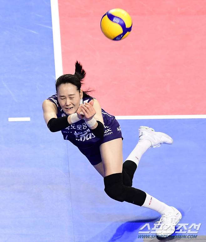 9일 화성 실내체육관에서 배구 V리그 여자부 IBK기업은행과 한국도로공사의 경기가 열렸다. 볼을 살리기 위해 몸을 날리는 도로공사 임명옥 리베로. 화성=송정헌 기자songs@sportschosun.com/2024.01.09/