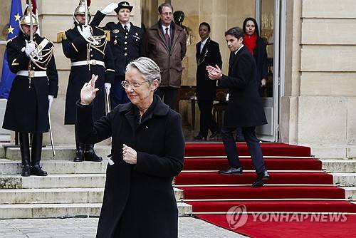 New French prime minister Gabriel Attal, right, applauds as outgoing prime minister Elisabeth Borne leaves after the handover ceremony, Tuesday, Jan. 9, 2024 in Paris. Gabriel Attal was named as France's youngest-ever prime minister, as President Emmanuel Macron seeks a fresh start for the rest of his term amid growing political pressure from the far right. (Ludovic Marin, Pool via AP) POOL PHOTO