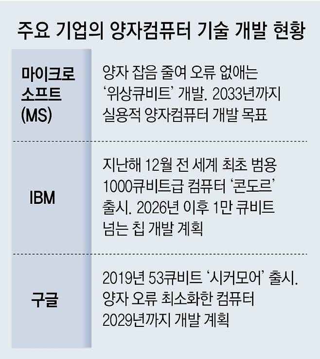 양자컴퓨터는 그간 인류의 난제로 꼽혔던 기후 변화, 신약 개발, 우주 현상 등의 분야에서 게임 체인저로 주목받고 있다. MS뿐만 아니라 IBM과 구글 등 해외 빅테크들도 앞장서서 양자컴퓨터 개발에 몰두하고 있다. 양자컴퓨팅 분야에서 가장 선두를 달리고 있는 기업은 IBM이다. 지난해 12월 세계 최초로 범용 1000큐비트급 양자컴퓨터 ‘콘도르’를 선보였다. 2025년까지 4000큐비트급 양자컴퓨터 개발을 목표로 하고 있다. 2019년 53큐비트급 양자컴퓨터인 ‘시커모어’를 출시한 구글도 2029년까지 양자 오류를 최소화한 컴퓨터를 개발하겠다는 계획이다.