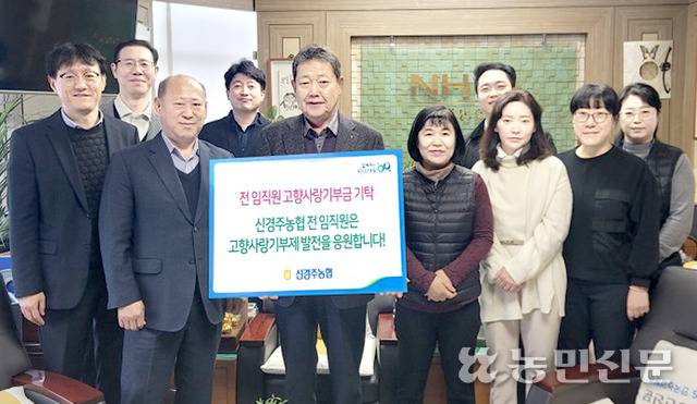경북 신경주농협(조합장 김병철, 사진 앞줄 왼쪽 세번째) 모든 임직원이 고향사랑기부제(고향기부제)에 동참하며 성공적인 정착을 기원했다.