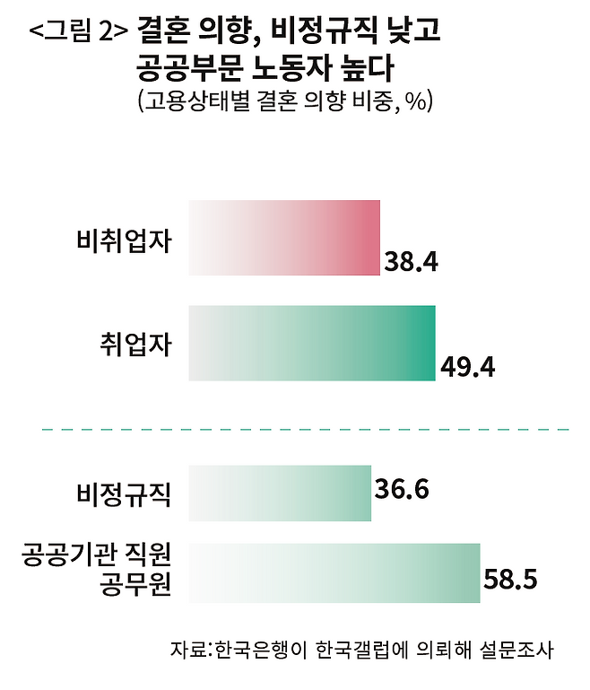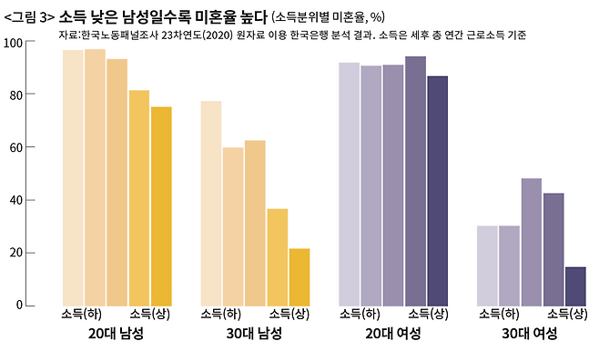 노동시장의 이 같은 변화는 결혼과 출산에 직접적 영향을 미친 것으로 보인다. 한국은행이 한국갤럽에 의뢰해 청년층 2000명을 대상으로 2022년 9월 실시한 설문조사 결과, ‘장래에 결혼할 의향이 있다’는 응답은 취업자(49.4%)가 비취업자(38.4%)보다 높았다. 취업을 했더라도 비정규직인 경우에는 결혼 의향이 있는 비율이 36.6%로 비취업자보다도 오히려 더 낮게 나타났다. 반면 공공기관 직원 또는 공무원의 결혼 의향은 58.5%로 높았다(〈그림 2〉 참조). 한국은행이 2020년 '한국노동패널조사' 원자료를 분석한 결과, 20~30대 남성의 경우 소득이 낮을수록 미혼율이 높아지는 경향이 뚜렷했다(〈그림 3〉 참조). 여기서 남녀 차이가 나는 이유는 해당 출생연도의 성비상 남성이 더 많기 때문으로 보인다.