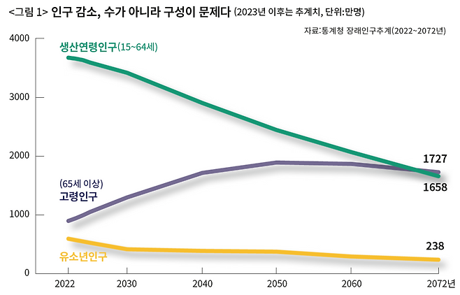 “큰 착각이다.” 인구학자인 이상림 한국보건사회연구원 인구모니터링센터장이 고개를 저었다. “의외로 많은 분들이 지금의 한국 사회 그대로 ‘사람 수’만 줄어드는 게 인구 감소라고 생각한다. 그래서 인구 감소가 나쁘지 않거나 적어도 자기 삶에 별 영향을 주지 않으리라 여긴다. 그러나 저출생과 고령화는 하나의 사건이다. 젊은 사람이 줄고 늙은 사람이 늘어나면서 인구가 줄어들기 때문에 문제가 되는 것이다.” 통계청 장래인구추계를 보면, 2022년 3674만명이던 생산연령인구(15~64세)는 50년 뒤인 2072년 1658만명으로 줄어든다. 반면 같은 기간 65세 이상 고령인구는 898만명에서 1727만명으로 늘어나 생산연령인구를 추월한다. 인구수가 줄어들 뿐만 아니라 구성 자체가 질적으로 달라진다(〈그림 1〉 참조).